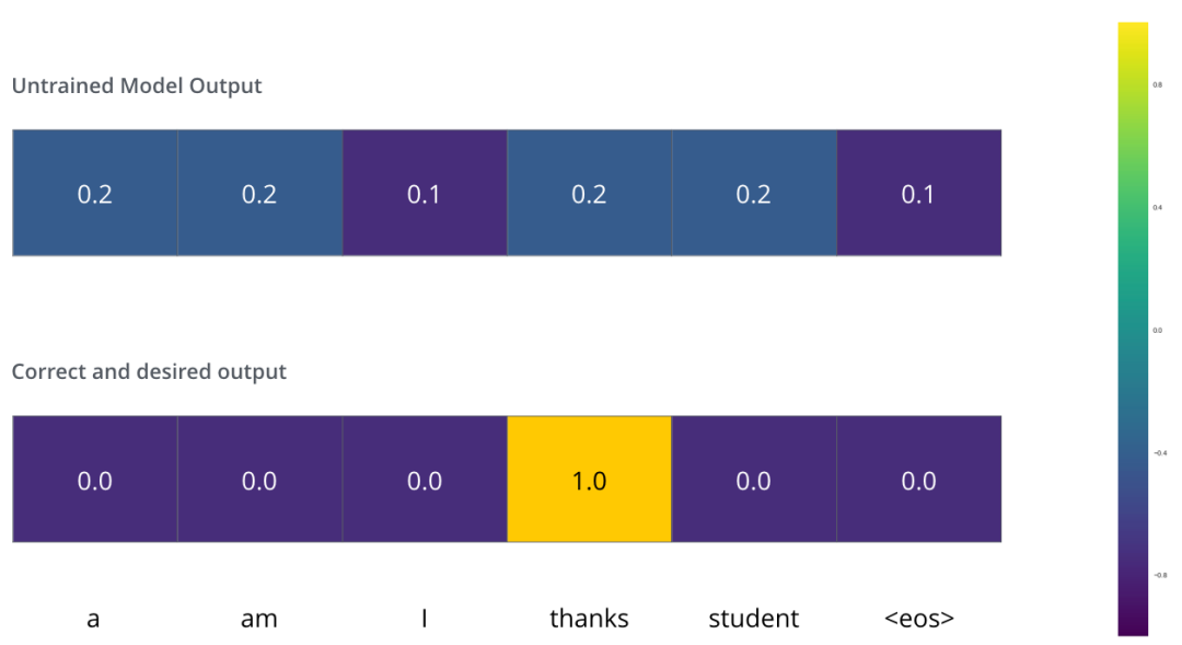 这意味着,我们希望模型的输出是一个概率分布,指向 “thanks” 这个词。但由于这个模型还没有经过训练,这种情况可能不会马上发生。