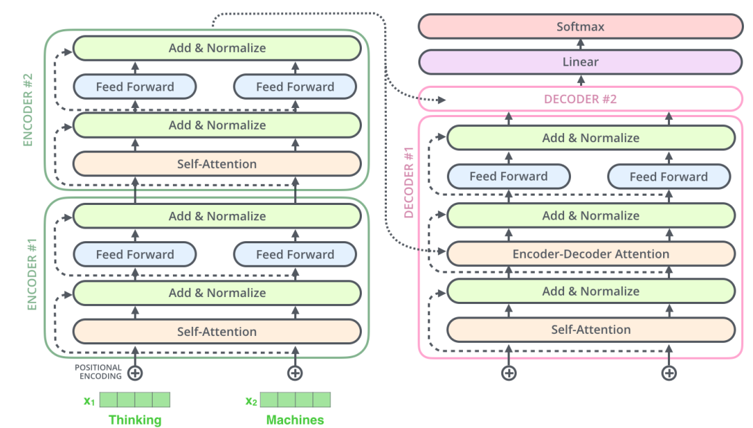 这同样适用于解码器的各个子层。如果我们设想一个包含两个堆叠编码器和两个堆叠解码器的 Transformer,它的结构大致如下: