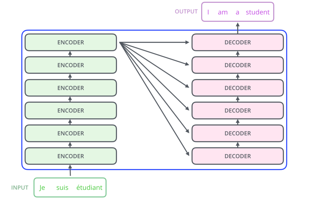 编码器模块由多个编码器堆叠而成(论文中是堆叠了六层编码器——这个数字并没有什么神奇之处,完全可以尝试其他层数的组合)。解码器模块也是相同数量的解码器堆叠而成。