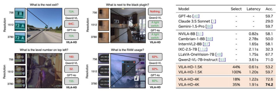 根据用户需求灵活调整响应速度:VILA-HD 可以灵活调整处理的高清区域大小,从而可以适应不同的推理开销要求。