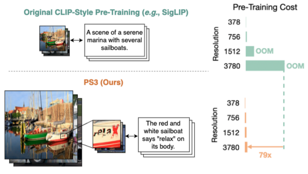 传统方法,例如 SigLIP,会对全局视觉表征和全局文字描述表征做对比学习。与之相比,PS3 采用局部对比学习策略:仅对图像中的局部区域与局部区域的细节描述进行编码和对比。这种方式不仅保留了高分辨率的细节理解能力,由于模型不需要处理整张高清图像而只需要处理局部区域,也极大降低了计算成本。