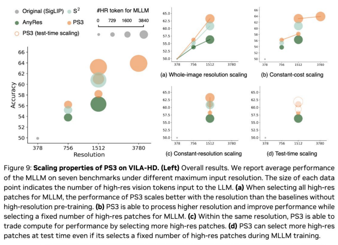 更有趣的是,团队发现在 VILA-HD 上,PS3 展现了不同的有趣的扩展能力。在提升下游任务分辨率时,PS3 的性能比没有高清预训练的模型性能提升的要更快。PS3 还可以在提升分辨率的同时选择固定大小的高清区域,从而在训练与推理开销保持不变的情况下提升性能。除此之外,PS3 还可以通过扩展训练或测试时的计算量来进一步提高性能。