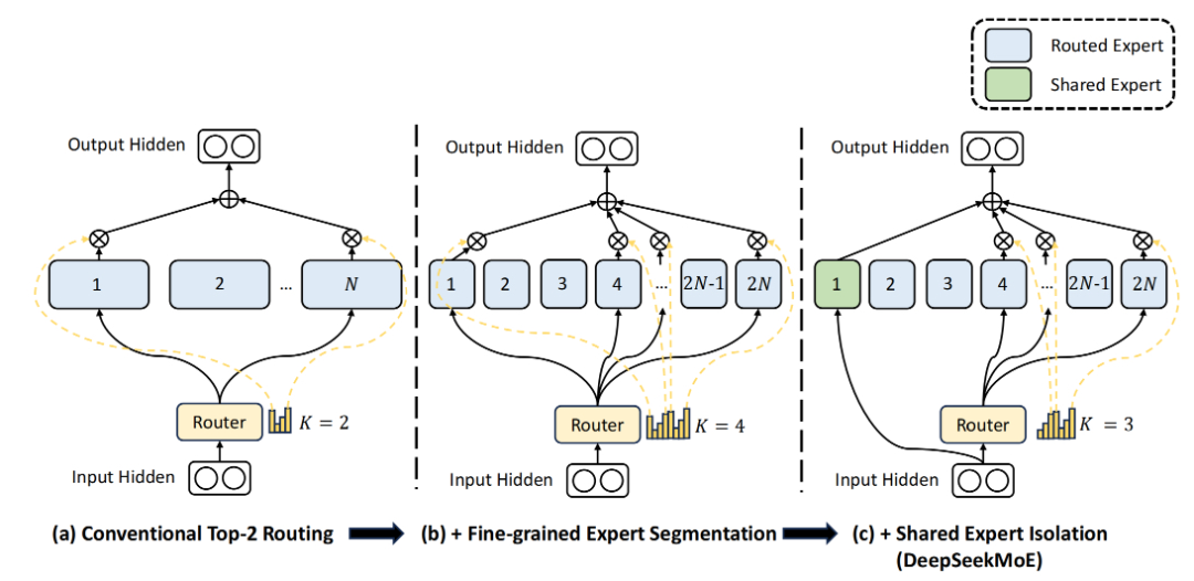 Shared Expert Isolation-共享专家隔离,将某些专家隔离为共享专家,始终激活,旨在捕捉和巩固不同上下文中的共同知识。