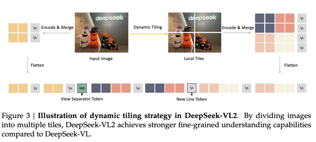 Vision Encoder:DeepSeek-VL2采用的也是 SigLIP,同时引入了动态切片策略(Dynamic Tiling Strategy),能够处理不同分辨率和长宽比的高分辨率图像。传统的图像编码方法往往固定分辨率,导致在处理较大或不规则图像时性能下降。动态切片策略通过将高分辨率图像分割成多个小块进行处理,减少了计算成本,同时保留了详细的视觉特征。该方法避免了传统视觉编码器的固定分辨率限制,使得模型在处理复杂图像任务(如视觉引导、文档分析等)时具有更好的性能。