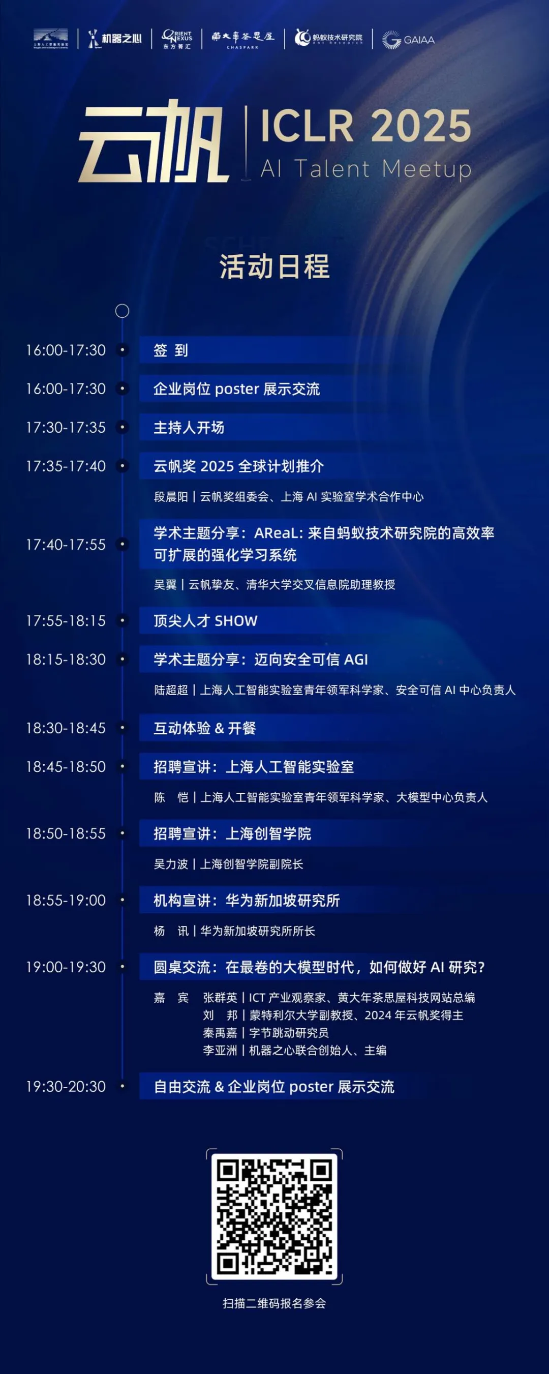 为了与众多青年才俊共同探讨前沿技术与应用落地等关键问题,并为海内外优秀人才搭建与企业深度对话的桥梁,赋能人才发展。「云帆・ICLR 2025 AI Talent Meetup」设置了:云帆奖 2025 全球计划推介、学术主题分享、顶尖人才 SHOW、互动体验、招聘宣讲、圆桌交流、企业岗位 poster 展示、晚宴交流等精彩环节。今天 Meetup 日程正式公布。欢迎感兴趣的读者扫描日程下方二维码报名(报名将于 4 月 20 日晚 24:00 截止)。