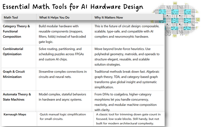 这些名字可能会勾起你对老课本的回忆,但请相信我:它们早已不再是当初的“训练轮”。借助范畴论和现代代数的新视角,它们已经进化为服务于下一代 AI 硬件的强大工具包,能够支持脉冲神经网络、可重构 FPGA 以及更多复杂系统。(想深入了解,请参考下方的表 3)