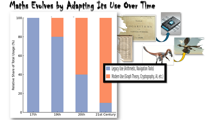 图 2:数学演化的常见模式是什么?是将旧工具重新用于全新的领域。对数最初只是为了简化繁琐乘法的算术捷径,而在信息时代,它已被重新定义为密码学、复杂性理论和网络建模中的结构性工具。来源:ReadingFeynman、HistoryOfMathAndTech、ChoppingLogs、MAA