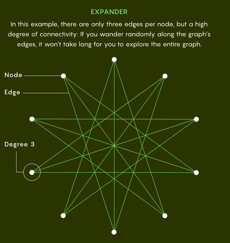 为了回答这些问题,研究人员需要精确地定义扩展图。有很多方法可以做到这一点,其中一种是:为了将扩展图拆分成两个独立的部分,你需要擦除许多边。另一种是:如果你沿着图的边缘徘徊,在每一步随机选择方向,你很快就能探索整个图。