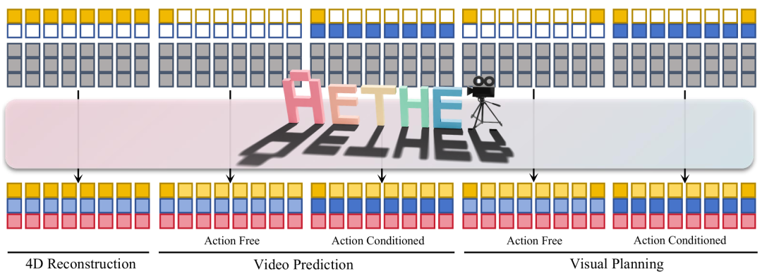 为了支持同时完成重建、预测和规划这三类不同任务,AETHER 设计了一种统一的多任务框架,首次实现在同一个系统中整合动态重建、视频预测和动作规划。