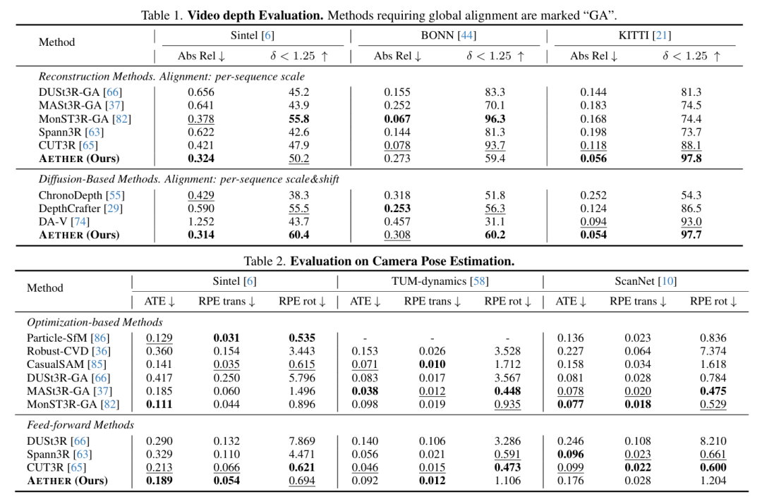在多个实验任务中,AETHER 在动态场景重建方面已达到甚至超过现有 SOTA 水平。同时发现在多任务框架下,各个任务有很好的促进,尤其在动作跟随的准确度上面有较大的提升。