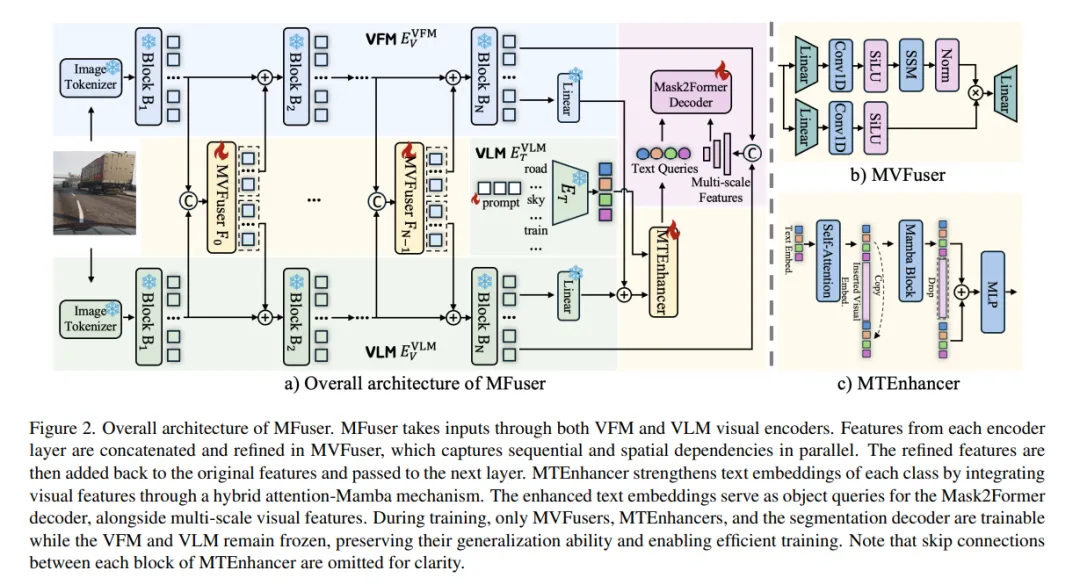 我理解MVFuser是负责“磨合”VFM和VLM,让它们更好地相互理解,协同工作。MTEnhancer则是负责“精修”文本信息,让模型更好地理解图像内容。如果少了MVFuser,VFM和VLM可能会出现“各说各话”的情况,信息无法有效融合。如果少了MTEnhancer,模型可能无法准确理解图像内容,导致分割效果不佳。所以这两个模块都很重要。