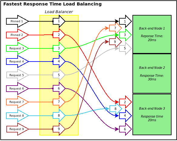 最快响应算法根据负载均衡器到每一个后端服务器节点的网络响应时间(RTT时延),并将下一个到达的连接请求动态分配给响应时间最短的节点。该算法能够实现应用请求的快速响应,提高业务请求的响应时间,但是会出现请求集中在几个响应最快的节点上。如下图所示,节点1和节点3的响应时间为20ms、节点2为30ms,根据最快响应算法,连接请求负载分发到节点1和节点3中。