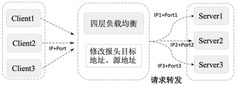四层负载均衡工作在OSI模型的传输层,在接收到客户端请求后,通过修改数据包的地址信息(IP+端口号)将流量转发到应用服务器。在实现上负载均衡设备接收到客户端请求后根据特定的算法转发请求,同时会将客户端的源地址转换为负载均衡设备的地址(NAT地址转换),服务器接收到请求后会处理请求并返回给负载均衡,负载均衡设备将请求返回给客户端,并将服务器的源地址改为负载均衡设备的地址。