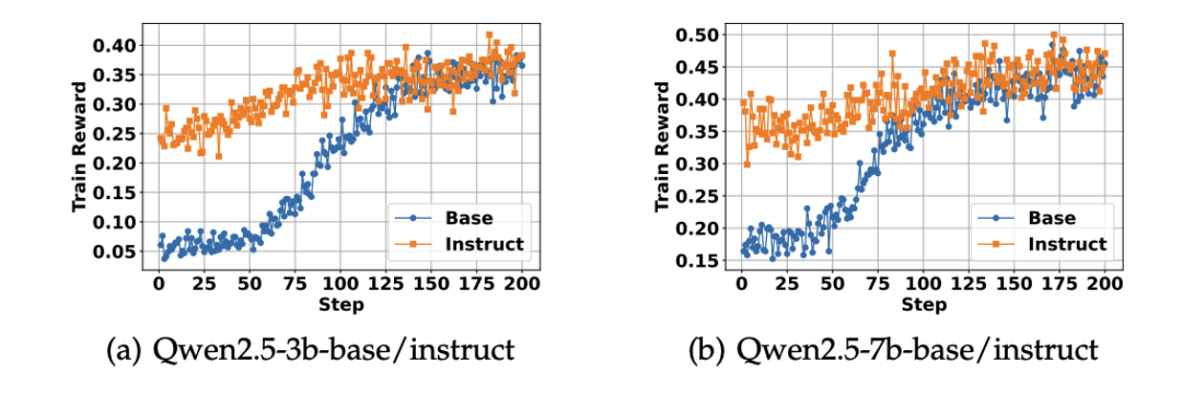 实验显示:Instruct 模型初始表现更好,训练收敛更快;但随着训练推进,Base 模型最终可达到相近甚至更优的效果;强化学习弥合了两者在结构化推理任务中的能力差异。