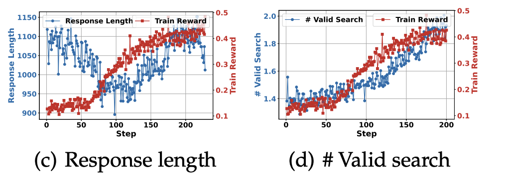 训练初期模型输出较短,搜索行为少;随着训练推进,模型逐渐学会更频繁调用搜索,响应长度增加;表明模型逐步掌握了「推理中搜索」的动态交互式策略。