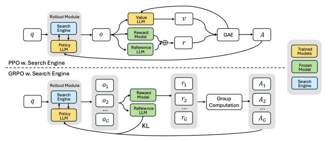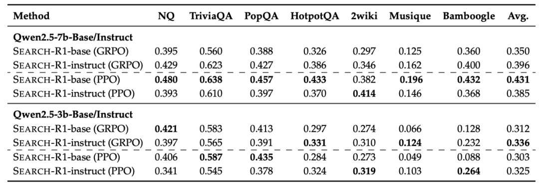 我们对两种 RL 优化策略进行了系统比较:GRPO 收敛更快,但在训练后期可能存在不稳定性;PPO 表现更稳定,最终性能略高于 GRPO,成为默认推荐配置;两者最终训练 reward 相近,均适用于 Search-R1 的优化目标。