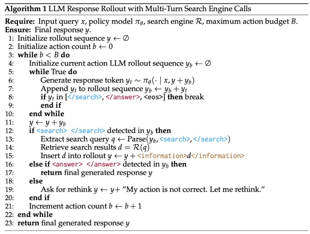 Search-R1 允许模型在回答前进行多轮推理与搜索交替进行。具体流程如下: