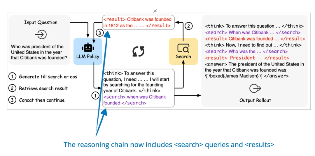 本文提出的 ReSearch 框架扩展了 DeepSeek-R1 论文中的强化学习方法,将搜索结果纳入推理过程。该模型会根据其正在进行的推理链学习何时以及如何进行搜索,然后将检索到的信息用于后续的推理步骤。