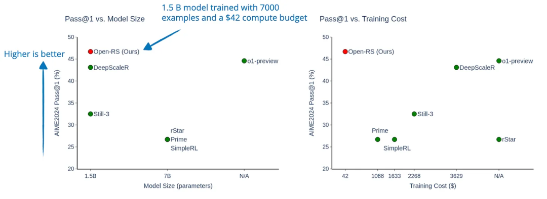 因此,他们使用 1.5B 的 DeepSeek-R1-Distill-Qwen 模型,发现仅需 7000 个训练样本和 42 美元的计算预算,强化学习微调就能带来显著的提升。例如,在 AIME24 数学基准测试中,这些改进足以超越 OpenAI 的 o1-preview。