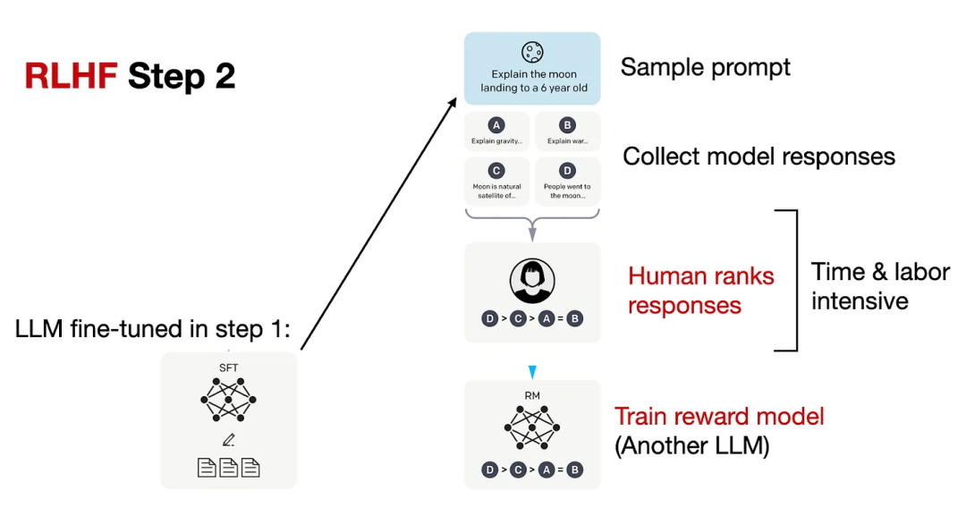 在 RLHF 步骤 2 中,我们使用监督微调得到的模型来创建奖励模型,如下图所示。