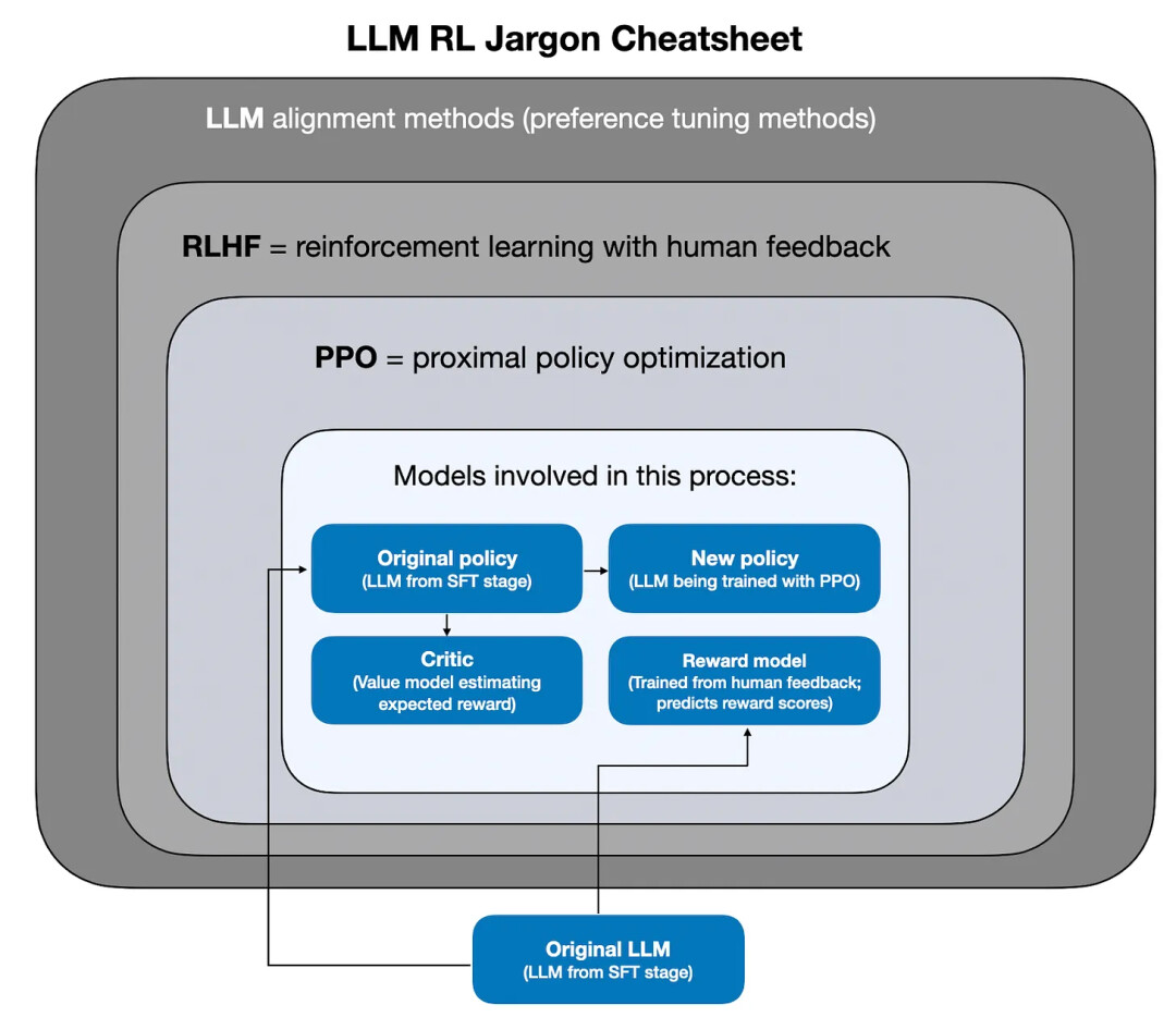然后,RLHF 使用一种称为近端策略优化 (PPO) 的算法进一步对齐 LLM。请注意,除了 PPO 之外,还有其他算法可以替代。我特意提到 PPO,是因为它是 RLHF 最初使用的算法,并且至今仍是最流行的算法。)