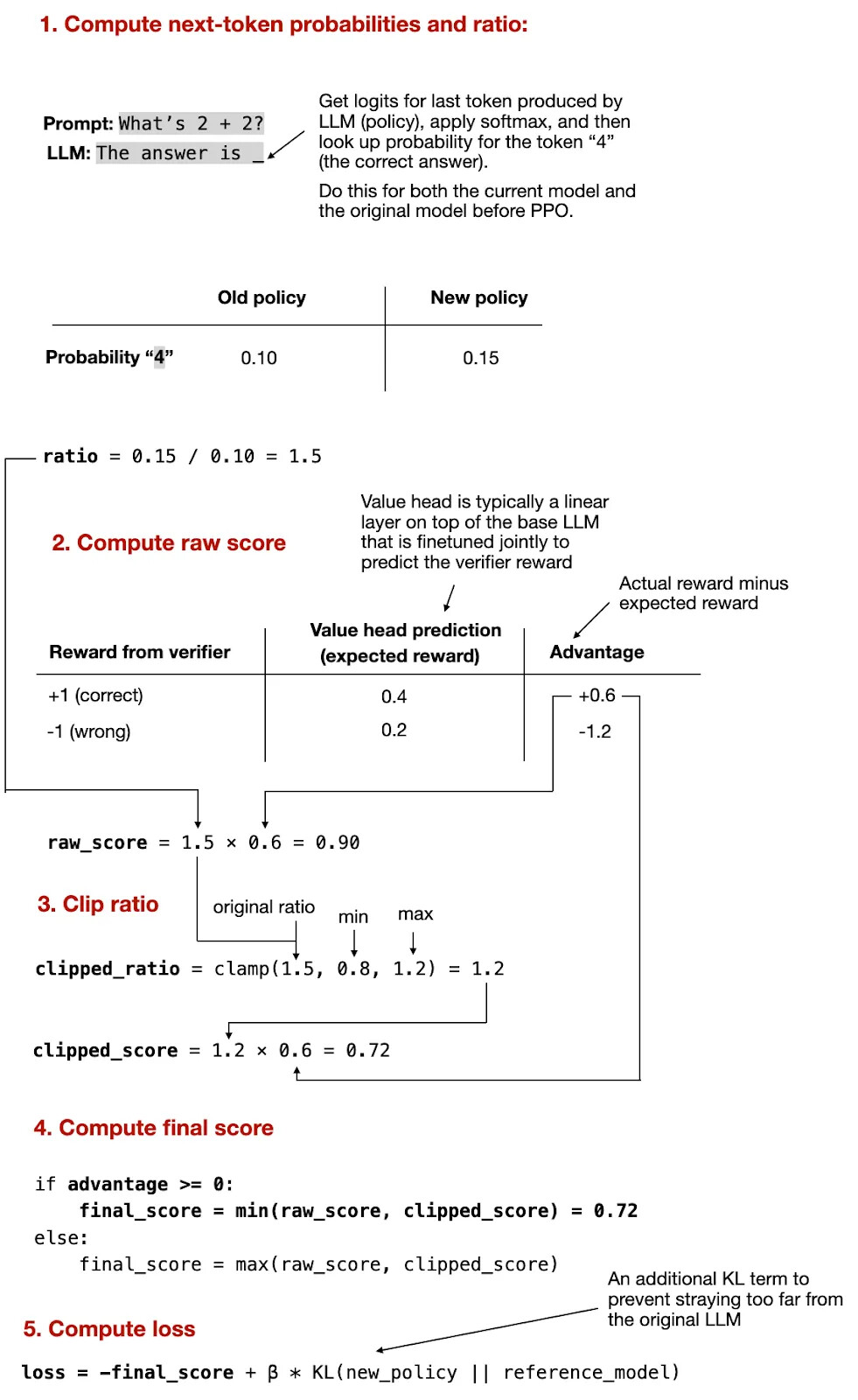 需要注意,这只是一个简化的描述。实际上,这涉及到广义优势估计(Generalized advantage estimation,GAE),这里不再赘述。然而,需要提及的一个重要细节是:预期奖励是由所谓的「评价者」(有时也称为价值模型)计算的,而奖励模型则计算实际奖励。也就是说,优势计算涉及另外两个模型,这些模型的规模通常与我们正在微调的原始模型相同。