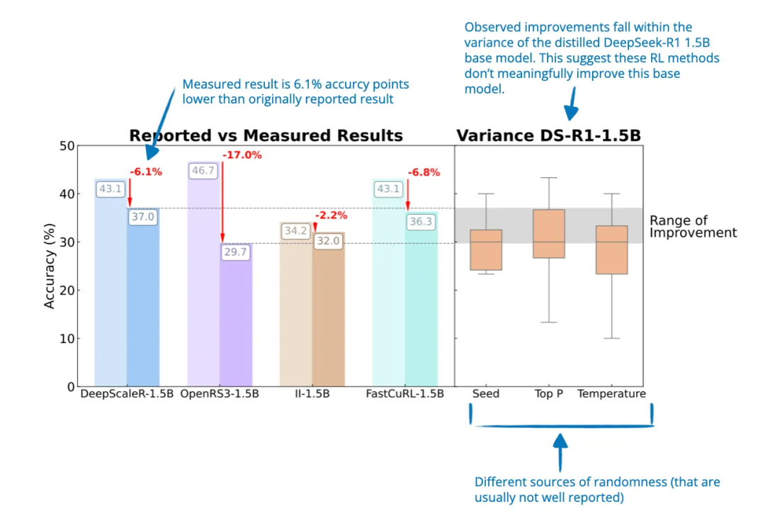 然而,与早期研究报告的 RL 效果大幅提升结论不同,本论文指出,部分性能提升可能只是随机波动带来的假象。作者通过实验证明,在小型基准测试任务(如 AIME24)中,仅随机种子的改变就可能导致性能分数出现几个百分点的波动,说明结果存在极高的不稳定性。