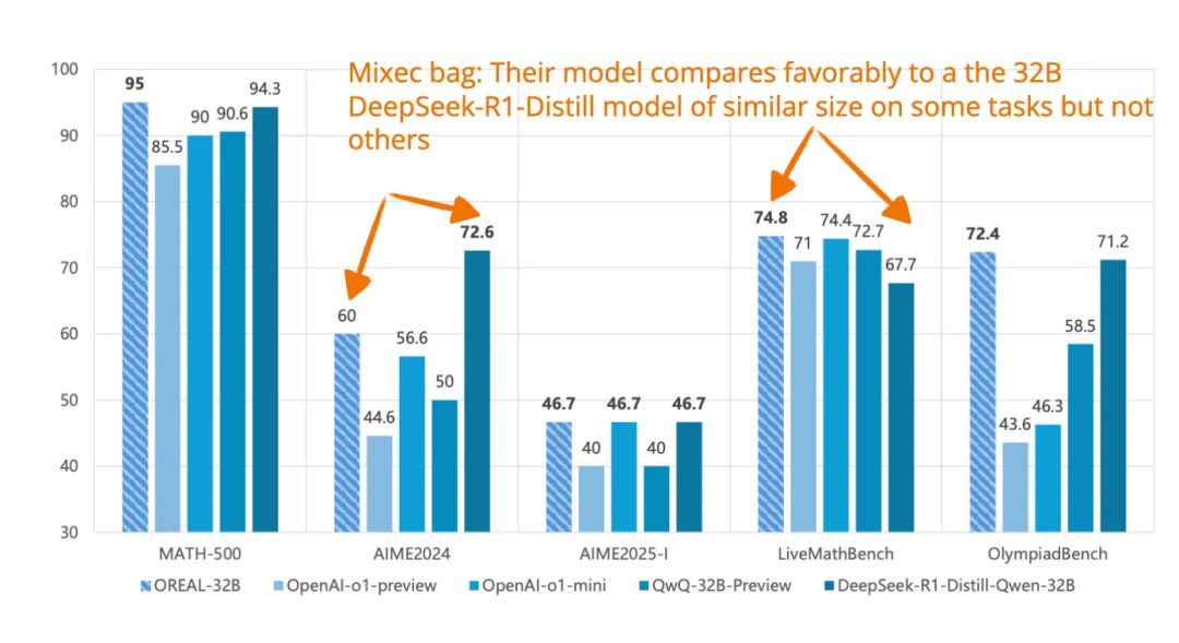 在使用与 DeepSeek-R1-Zero 相同的 Qwen-32B 基座模型的前提下,作者所构建的模型在多个推理基准任务上实现了超越后者的性能表现,同时训练步骤仅为其十分之一。