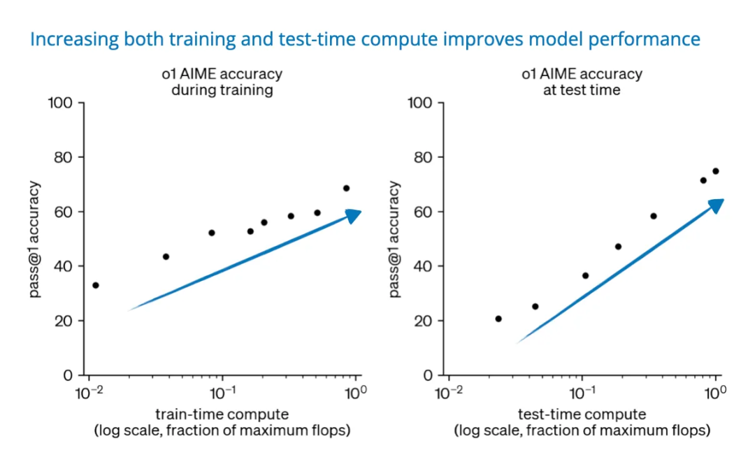 准确率的提升可以通过增加训练或测试时计算来实现,其中测试时计算与推理时计算、推理时扩展是同义词。图源:https://openai.com/index/learning-to-reason-with-llms/