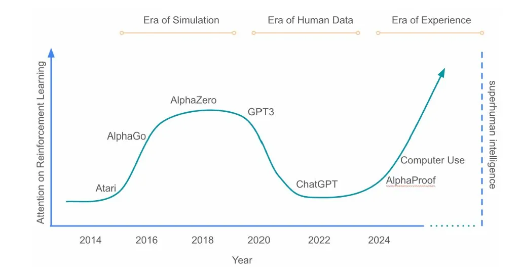 主流人工智能范式的简要时间线。纵轴显示该领域在强化学习(RL)上的总体努力和计算资源的占比。
