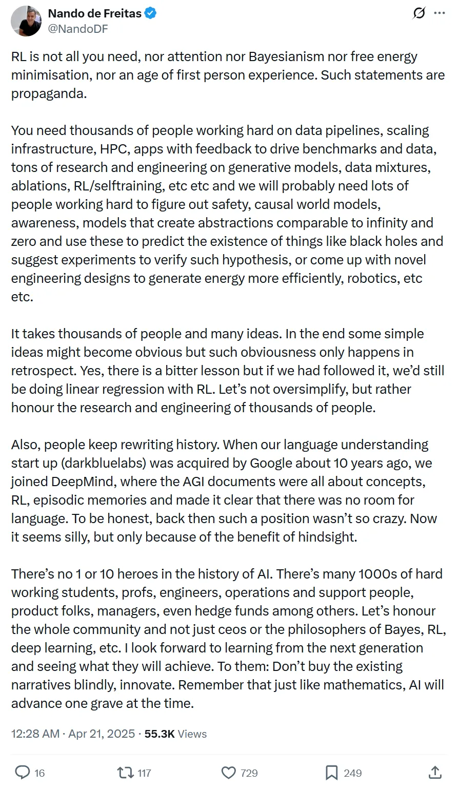 Freitas 进一步表示:「AI 的进步绝非仅靠单一技术或少数天才,而是需要成千上万的人的努力,他们协力构建数据 pipelines、扩展基础设施、部署高性能计算、开发具有反馈循环的应用来驱动基准测试和数据迭代,还需要投入海量研究工程资源到生成模型、数据混合、消融实验、强化学习 / 自训练等方向。