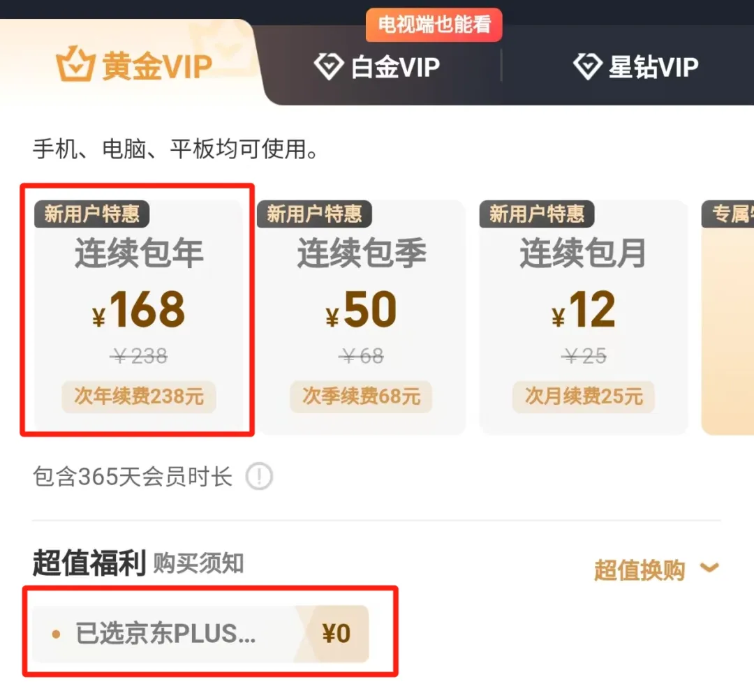 爱奇艺黄金会员年卡,新户连续包年首年价格168元,送京东Plus年卡!