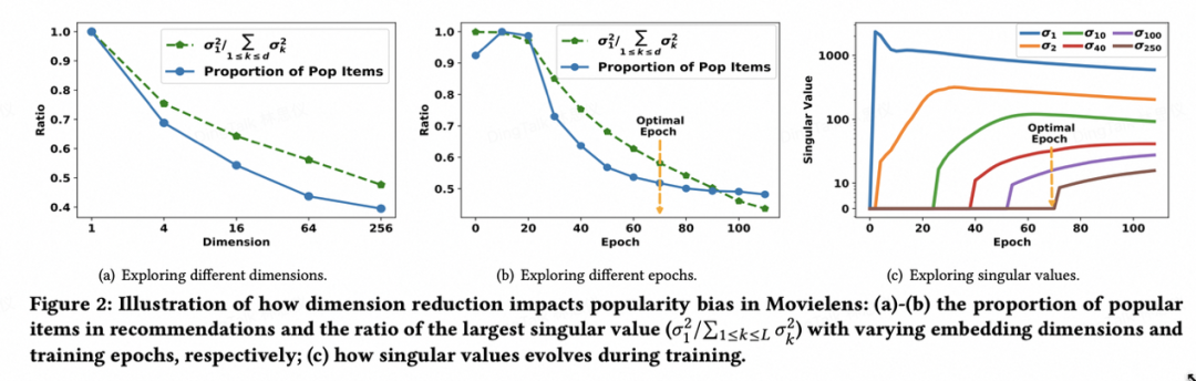 实验发现当 Embedding 维度减少时,主奇异值的相对重要性显著上升,推荐结果中热门物品的比例也随之增加。