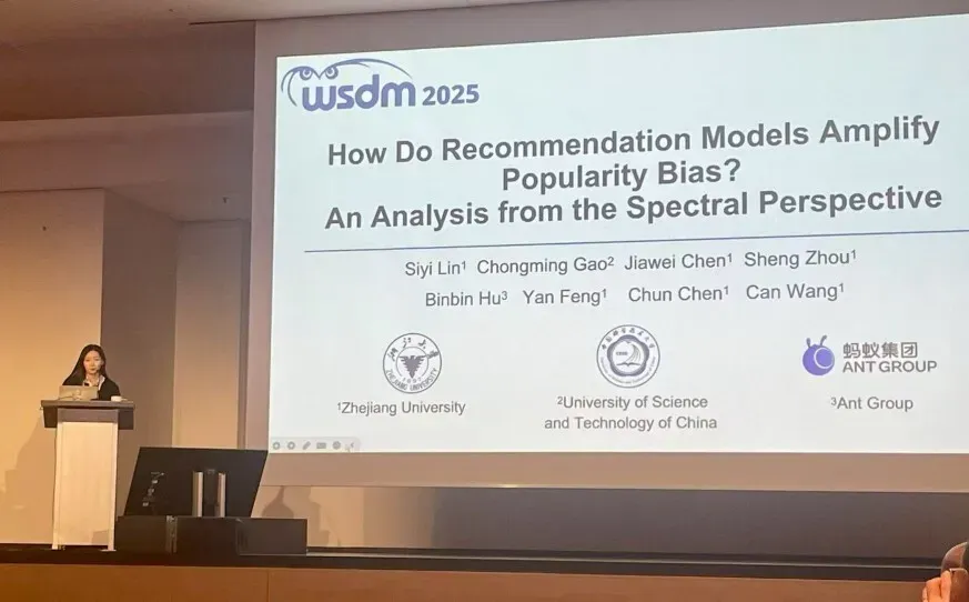这篇最佳论文题目为:How Do Recommendation Models Amplify Popularity Bias? An Analysis from the Spectral Perspective / 推荐模型如何放大流行度偏差?——基于谱视角的分析,由浙江大学计算机科学与技术学院 ZLST 实验室团队与中国科技大学、蚂蚁集团联合撰写。