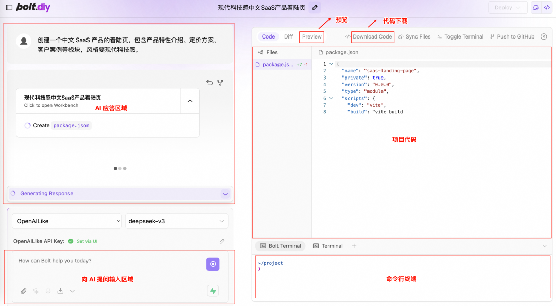 本文旨在介绍如何将 Bolt.diy 部署到云上,通过云原生应用开发平台 CAP 构建 Web 服务,通过其提供的函数计算资源,结合百炼的模型服务能力,采用deepseek-v3实现代码生成,可即时查看生成的代码及运行预览效果,体验流畅高效的开发流程。借助 CAP还可以快速便捷地部署开源项目,而无需担心底层资源管理和运维问题,从而专注于应用的创新和开发。