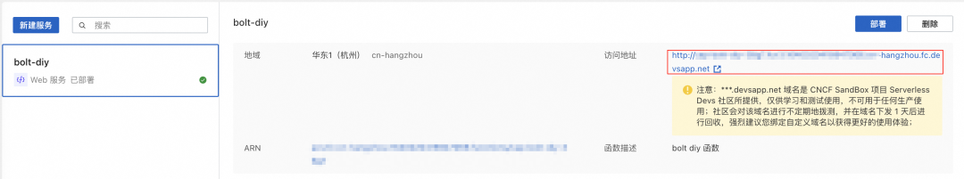 说明:当前测试域名由 Serverless Devs 社区所提供,仅供学习和测试使用,不可用于任何生产使用,域名有效期为 1 天,如果需要用于生产环境建议配置自定义域名,详细配置方式请参考:配置自定义域名[8]。