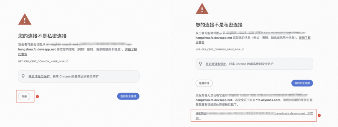 2. 点击访问地址,在浏览器中,会自动跳转为 HTTPS 链接地址。提示安全证书警告或错误,可以选择点击高级选项,然后点击继续前往以访问该网站。