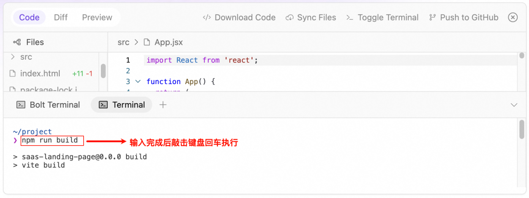 1. 如果 AI 编写的代码已符合需求,在Terminal中输入npm run build并敲击回车执行。