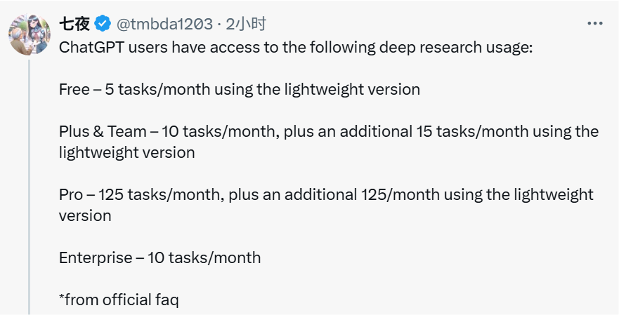 刚刚,OpenAI 宣布推出「轻量级」版本的 Deep Research,免费用户也可以使用!