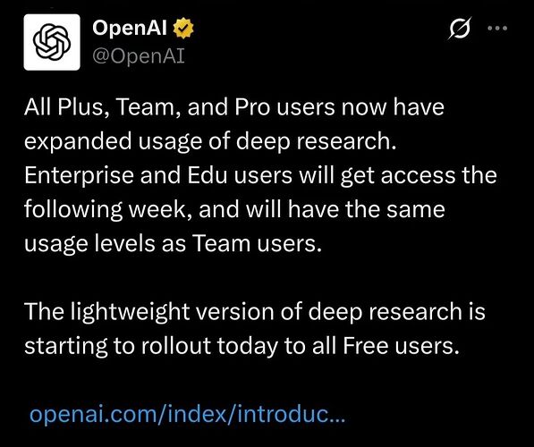 OpenAI 推出 Deep Research 轻量版,免费用户也能用啦!Plus 用户额度也提升,o4-mini 模型驱动,速度更快,成本更低!