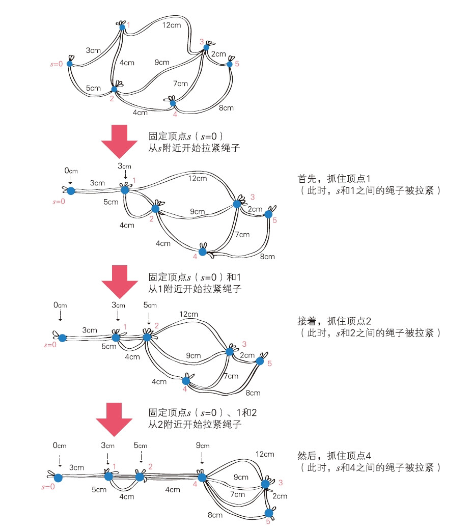 每个节点之间拉着一根绳子,从起点开始,你像是用手一根一根地把绳子往前拉,每次拉紧最近的节点。这个“拉绳子”的过程,正好对应了迪杰斯特拉算法的每一步。作者通过可视化,帮助读者跳出公式记忆,真正“理解”算法逻辑。