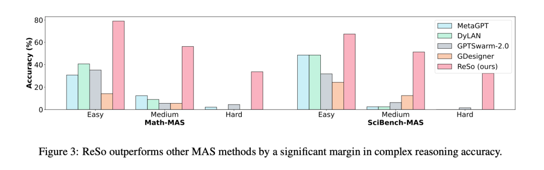 表 1 的实验结果实验表明,ReSo 在效果上匹敌或超越现有方法。ReSo 在 Math-MAS-Hard 和 SciBench-MAS-Hard 上的准确率分别达到 33.7% 和 32.3% ,而其他方法则完全失效。图 3 显示,在复杂推理任务中,ReSo 的表现全面优于现有 MAS 方法,展现了其卓越的性能和强大的适应性。