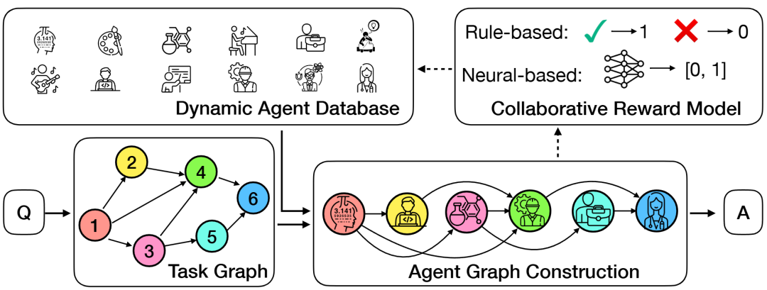 细粒度筛选(协作奖励模型 CRM):通过协作奖励模型对候选智能体进行细粒度评估,最终选择最优智能体。