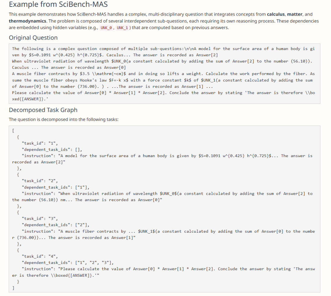 由于缺乏高质量的 MAS 数据集,作者提出了一种自动化方法来生成多智能体任务数据。这个过程包括随机生成任务图、填充子任务以及构建自然语言依赖关系。提出了一个单个 sample 就具有多学科任务的数据集。开源了数据合成脚本论文合成了 MATH-MAS 和 Scibench-MAS 数据集,复杂度有3,5,7。复杂度为 7 的意思为,单个题目中由7个子问题组成,他们来自不同的领域(数学,物理,化学)。子问题之间有依赖关系,评测模型处理复杂问题的能力。下图是个 Scibench-MAS 复杂度为 3 的例子: