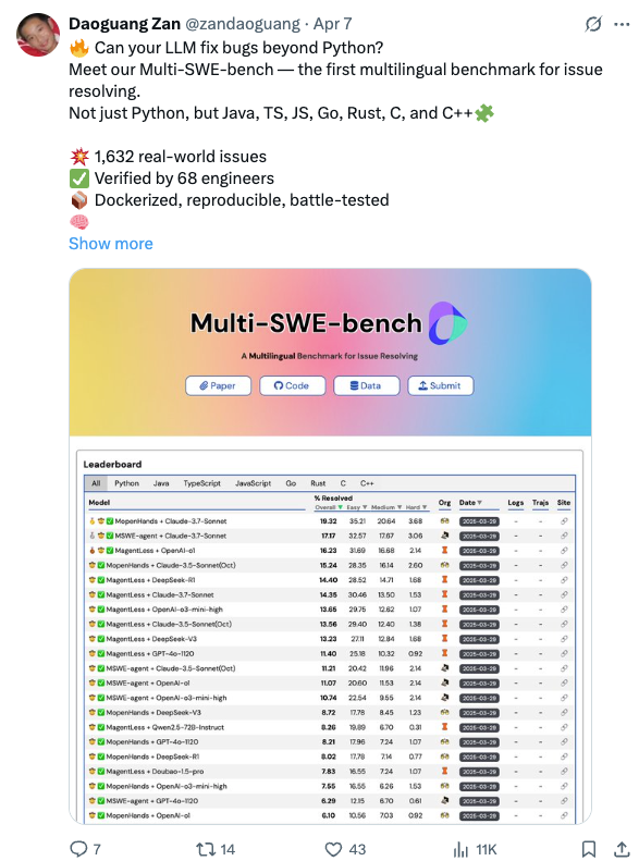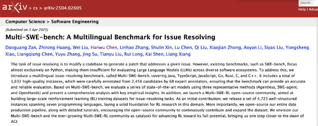 比如,Z 同学构建并开源了首个多语言代码修复基准 Multi-SWE-bench,在 SWE-bench 基础上,首次覆盖 Python 之外的 Java、TypeScript、C、C++、Go、Rust 和 JavaScript 七种编程语言,1632 个真实修复任务,是真正面向“全栈工程”的评测基准,其数据均来自 GitHub issue,历时近一年构建,以尽可能准确测评和提高大模型高阶编程智能水平。
