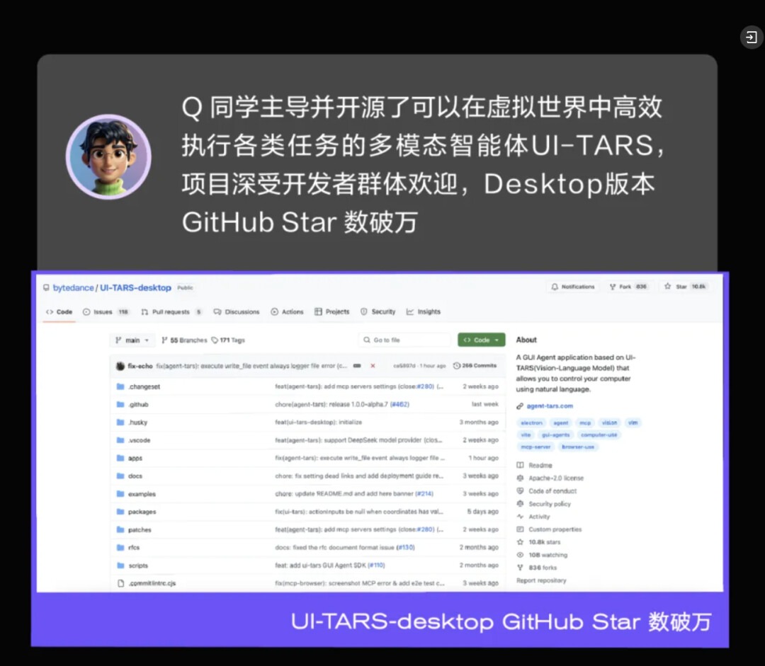 另一位 Q 同学主导并开源了可以在虚拟世界中高效执行各类任务的多模态智能体项目深受开发者群体欢迎,Desktop 版本 GitHub Star 数破万。