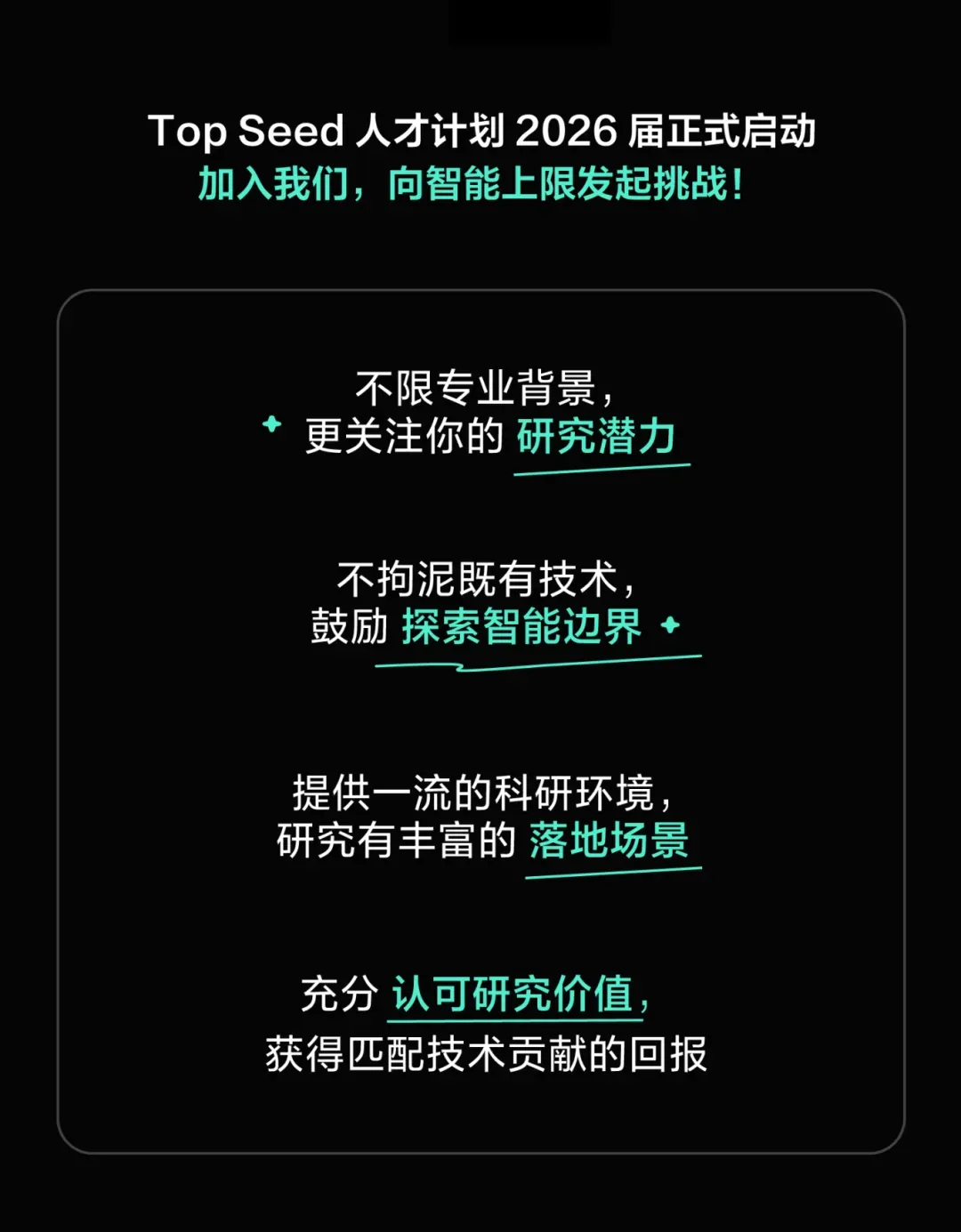 InfoQ 了解到,Top Seed 人才计划是字节跳动去年 5 月发起的面向应届博士毕业生的招聘,同年 7 月,字节推出针对在校博士生的 Top Seed 研究实习生专项,共同为旗下豆包大模型团队筛选人才。