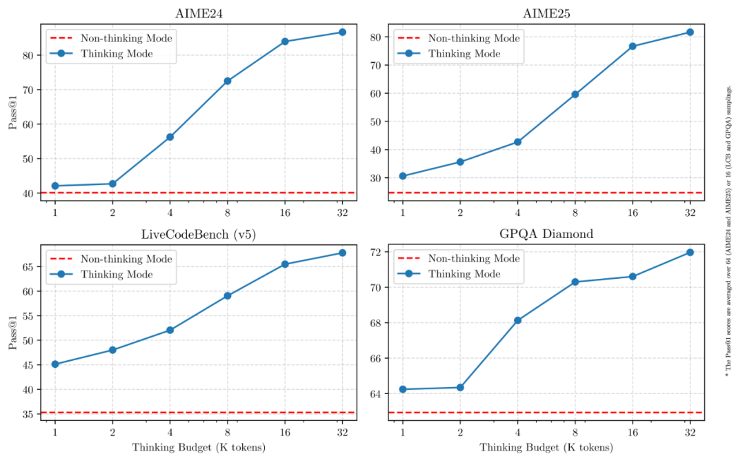 该设计使 Qwen3 展现出与推理预算成正比的、可扩展且平滑的性能提升。用户能够更轻松地根据不同任务配置推理预算,在成本效率与推理质量之间实现更优的平衡。