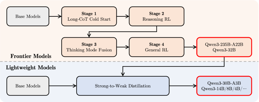为了开发能够兼顾逐步推理与快速响应的混合模型,团队设计并实现了一个四阶段的训练流程,该流程包括:(1) 长链式思维(CoT)冷启动,(2) 基于推理的强化学习(RL),(3) 思维模式融合,以及 (4) 通用强化学习。