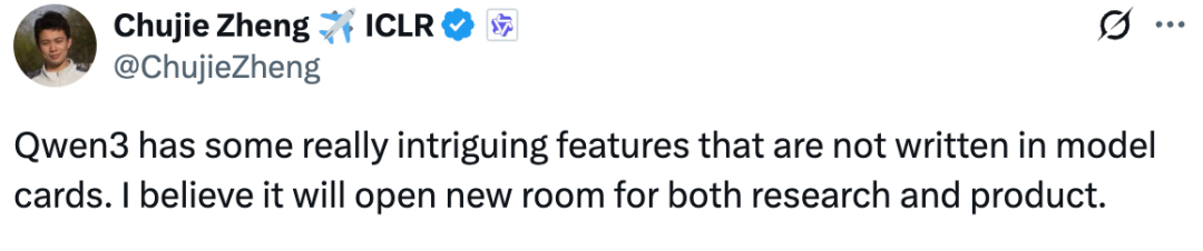 此外,研究员 Chujie Zheng 表示,Qwen3 有一些非常有趣的功能没有在模型卡上写出来。